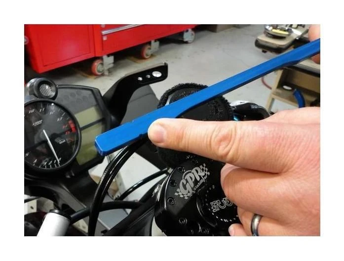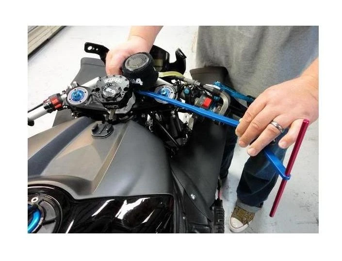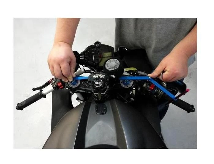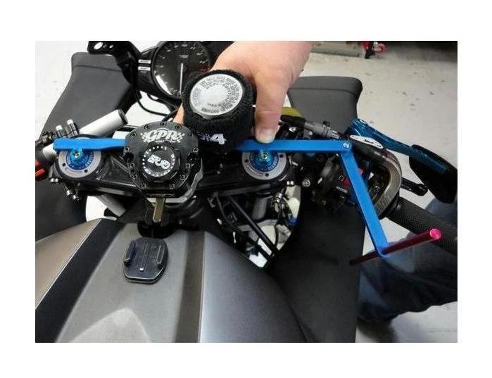 The Motion Pro Clip On Handlebar Alignment Tool will allow you to compare the angle of your handlebars, and adjust them so that the angle of sweep is the same on both sides.